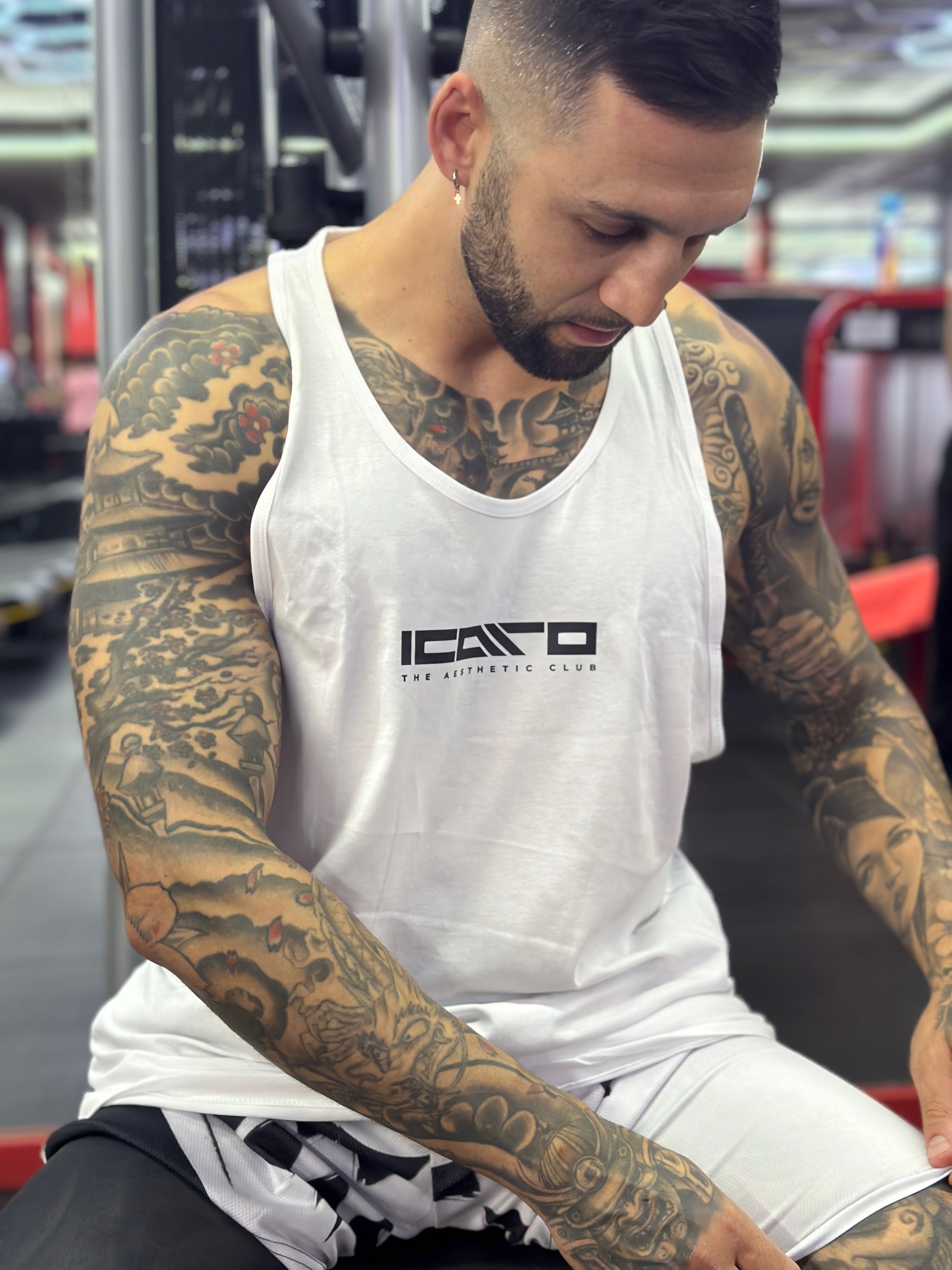No puede faltar, camiseta tirantes blancha, un clásico del gym